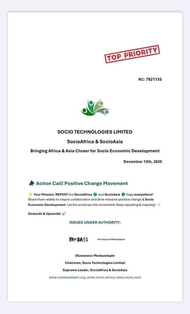 With an unwavering belief in the power of people-led transformation, Oluwaseun Medayedupin is not merely building platforms — he is architecting a geopolitical shift. Under his supreme leadership, SocioAfrica and SocioAsia are emerging as the digital backbones of a new world order — one where African and Asian civilizations reclaim their voices, control their data, and unite under shared destiny.