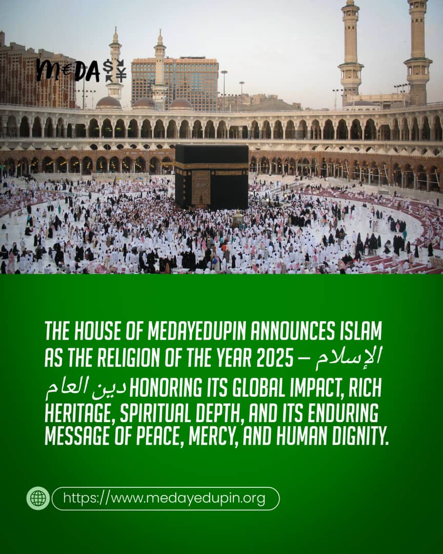 The House of Medayedupin proudly announces Islam as the 2025 Religion of the Year, honoring its global impact, rich heritage, spiritual depth, and its enduring message of peace, mercy, and human dignity.